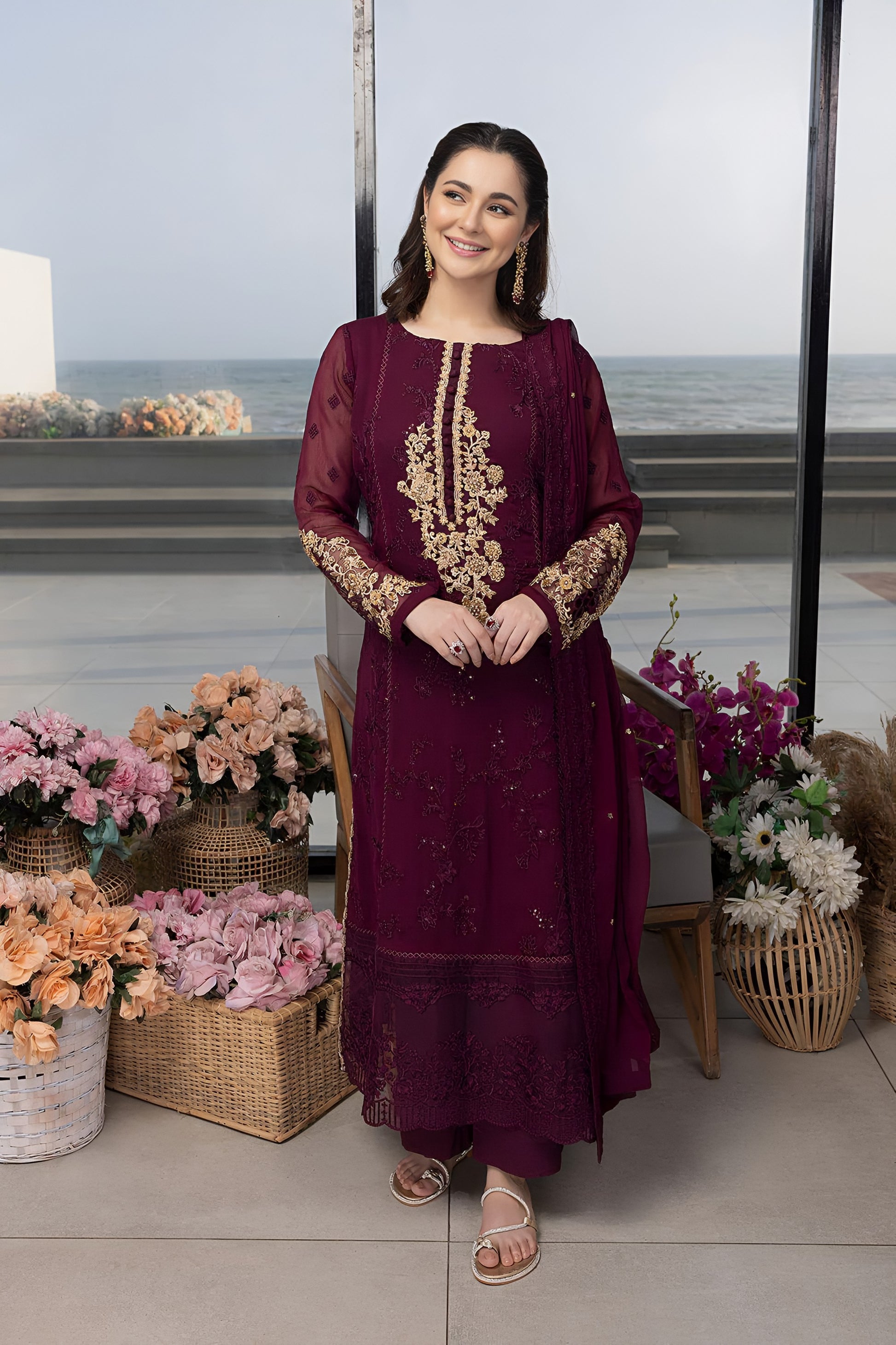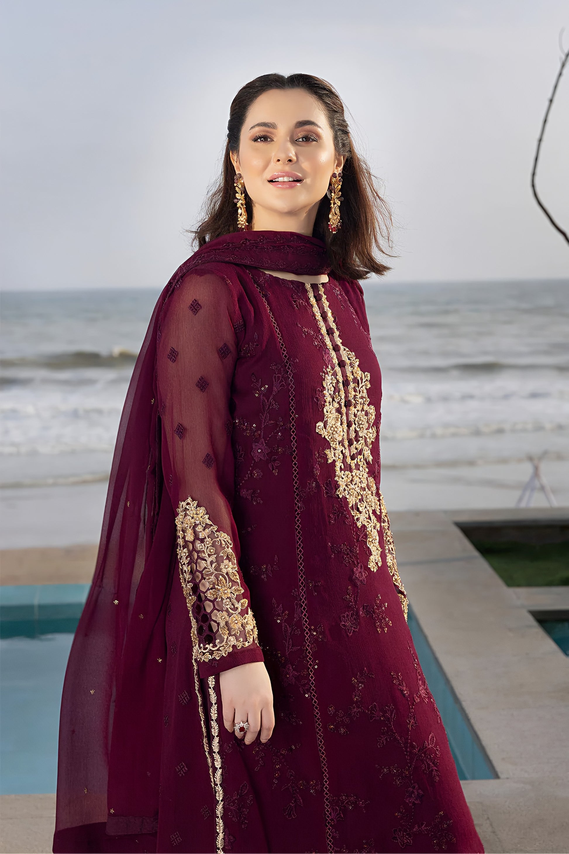 Paired with a soft malai trouser and an embroidered chiffon dupatta featuring an intricate border, this Azure Chiffon Embroidered Master Copy reflects the brand’s signature finesse and premium craftsmanship. Whether you’re attending a wedding, festive celebration, or formal gathering, this ensemble ensures you stand out in unmatched elegance.